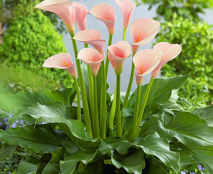 ПОСАДКА М УХОД. Рано весной в горшки для комнатной культуры, в открытый грунт — после того, как минует угроза заморозков. Клубни  сажают на глубину 5-10 см и хорошо проливают почву, поскольку каллы любят влагу. Для посадки каллы подойдет притененный участок. Идеальный вариант, место под негустыми кронами деревьев. Чтобы было достаточно светло, а солнечные лучи не обжигали листьев. Очень эффектно смотрятся каллы, рядом с искусственным водоемом. Отлично цветет и растет только в тепле, где температура не ниже 18°C, самая оптимальная температура 22-23°C. Не переносит сквозняков. Цветоносы этого растения высокие, которые идут прямо от низа растения. На открытом воздухе это прекрасное растение цветет 1 месяц, а в закрытом помещении — 14 дней. Осенью растения сбрасывают листья. На зиму клубни каллы нужно выкопать и хранить в непромерзаемом помещении. Цветение июнь-сентябрь (в зависимости от срока высадки клубней). Количество цветков зависит от размера клубня, может быть от 3 до 10.