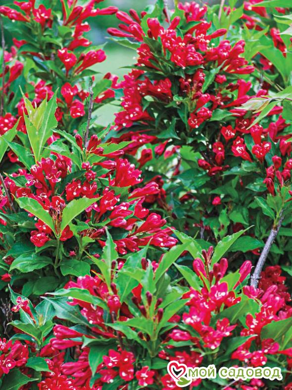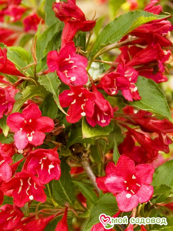 Вейгела Ред Принц (Weigela hybrida Red Prince) — невысокий раскидистый кустарник до 1,5м высотой и до 1,5м шириной. Цветет обильно в июне. Цветки многочисленные, колокольчатые, ярко-красные до 3,5см длиной, не выгорающие на солнце, собраны в соцветия по 3–4 шт., появляются на побегах прошлого года. Листья насыщенного зеленого цвета. Ежегодный прирост около 20 см. Повторное цветение в конце августа – начале сентября. Любит солнечные места, плодородные дренированные почвы. Уход за растением: Саженцы вейгелы нужно сажать в плодородную, воздухопроницаемую почву. Сразу учитывайте, что место постоянное, так как пересадить массивный куст с пышной кроной даже при желании будет практически невозможно. Для того, чтобы растение выглядело аккуратно, его нужно стричь, удаляя больные и поврежденные ветки и формируя крону так, как вам это нужно. В первый сезон кустарник нуждается в регулярном поливе, затем вейгелу поливают только при длительных засухах.